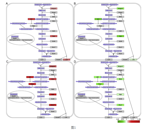 有趣的是,在海馬體和運動皮層中,與對照組健康大鼠相比,在安慰劑組CP大鼠中,各種膽固醇代謝途徑的催化酶的表達上調(diào),與安慰劑組CP大鼠(圖1)相比,白脈軟膏組各種膽固醇代謝途徑的催化酶的表達下調(diào)。同時,膽固醇合成途徑中的Hmgcs1、Idi1和sql催化酶也發(fā)生了類似的改變。運動皮質(zhì)中只有Mvd、Fdps和Dhcr7發(fā)生改變,而海馬中沒有。與安慰劑組CP大鼠相比,白脈軟膏組CP大鼠Rps6ka1表達明顯降低。同樣,第40S核糖核糖核糖蛋白RPS8、RPS9、RPS25和RPS27的表達也受到了控制。