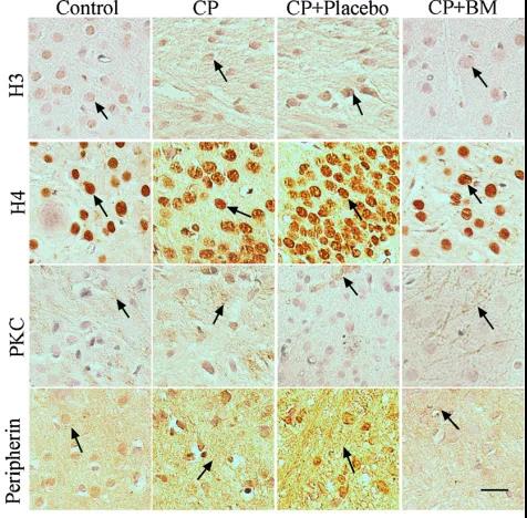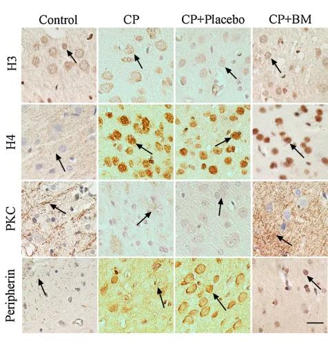 使用免疫組化法定位大鼠海馬中CP相關(guān)蛋白的表達(圖2),與對照組相比,在安慰劑CP大鼠中,組蛋白3.3和組蛋白4的表達被下調(diào)。然而,與對照組和安慰劑組相比,白脈組CP大鼠組蛋白3.3和組蛋白4表達上調(diào)。與對照組相比,模型組CP大鼠和安慰劑組CP大鼠的PKC-δ和外周蛋白表達上調(diào);然而,與對照組和安慰劑組相比白脈治療組CP大鼠的PKC-δ和周圍蛋白表達下調(diào)。